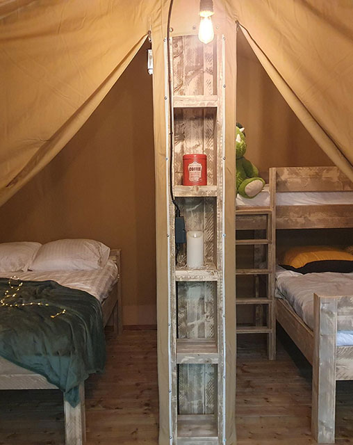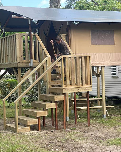 Modules en bois en hauteur (accès escalier) de 4.50 m x 4.50 m avec terrasse, sans sanitaire. Nos lodges sont confortables et spacieux, ils sont composés d’une chambre parentale avec 1 lit double et la seconde avec 1 lit double + 1 lit simple superposé.